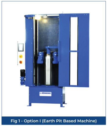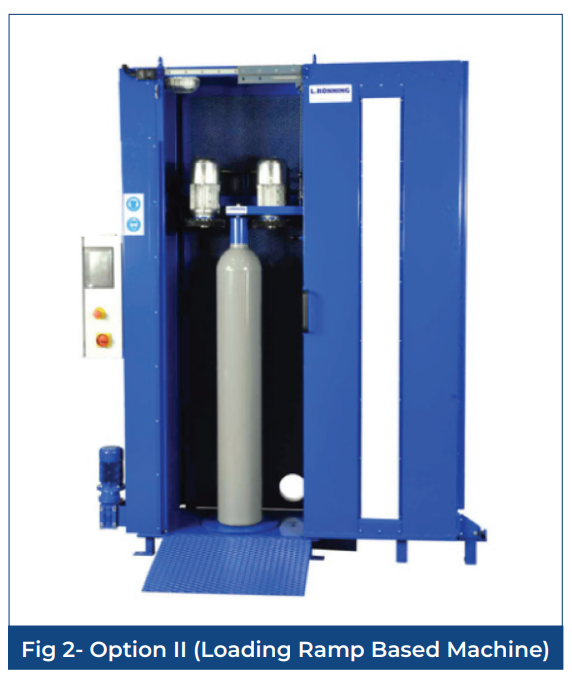 The CryoAir system is engineered to clean gas cylinders externally—including the curved shoulder of seamless cylinders. Following the cleaning cycle, users can easily repaint cylinders using an integrated roller system on a rotating disc.